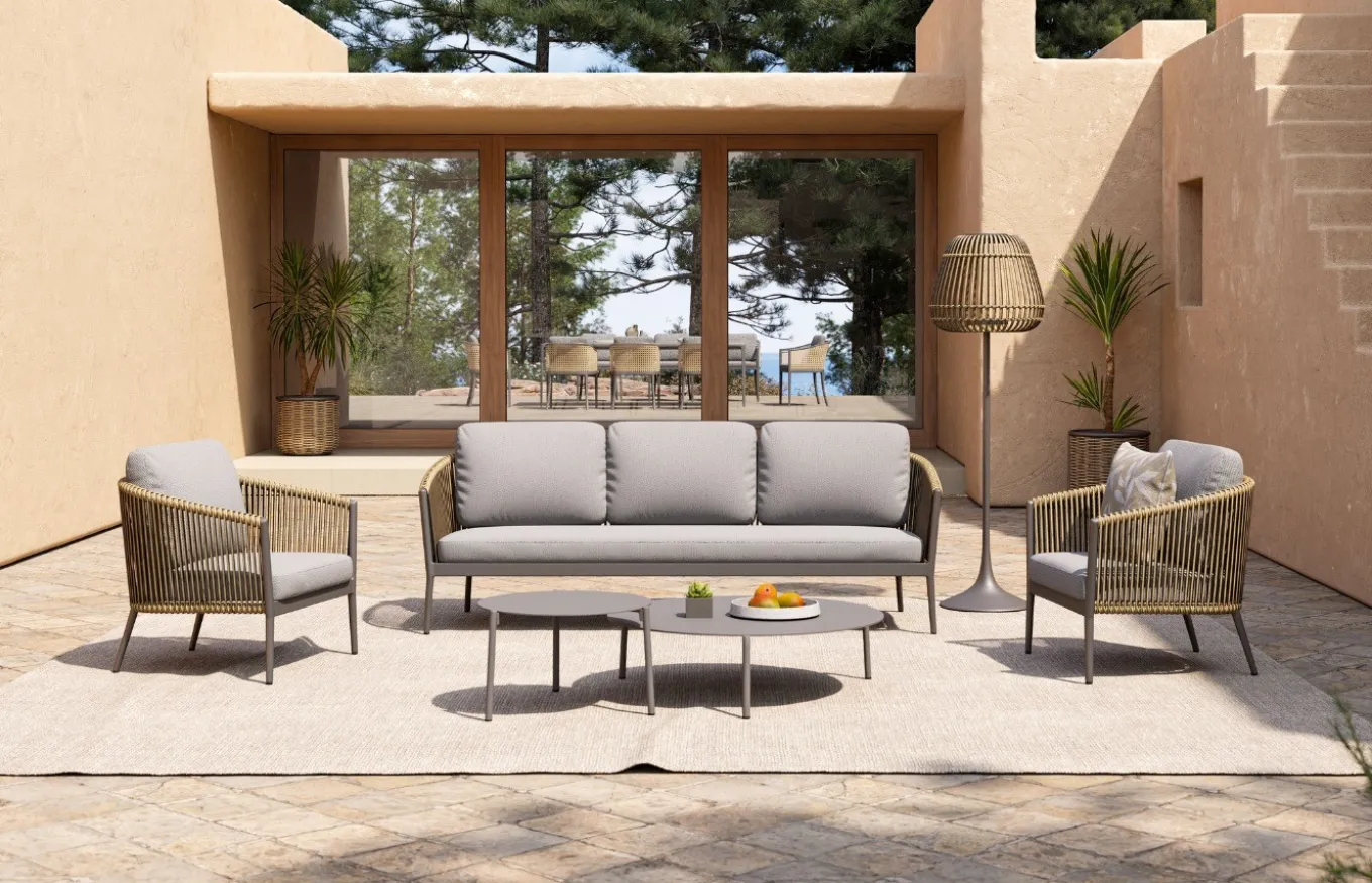 Tiene una estructura de aluminio en color carbón que proporciona resistencia y un respaldo y reposabrazos trenzados con fibra sintética de color natural, aportando calidez. Además, los cojines garantizan una increíble comodidad y pueden tapizarse en una gran variedad de acabados.