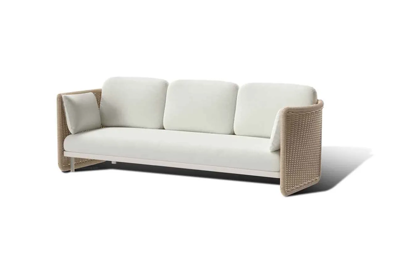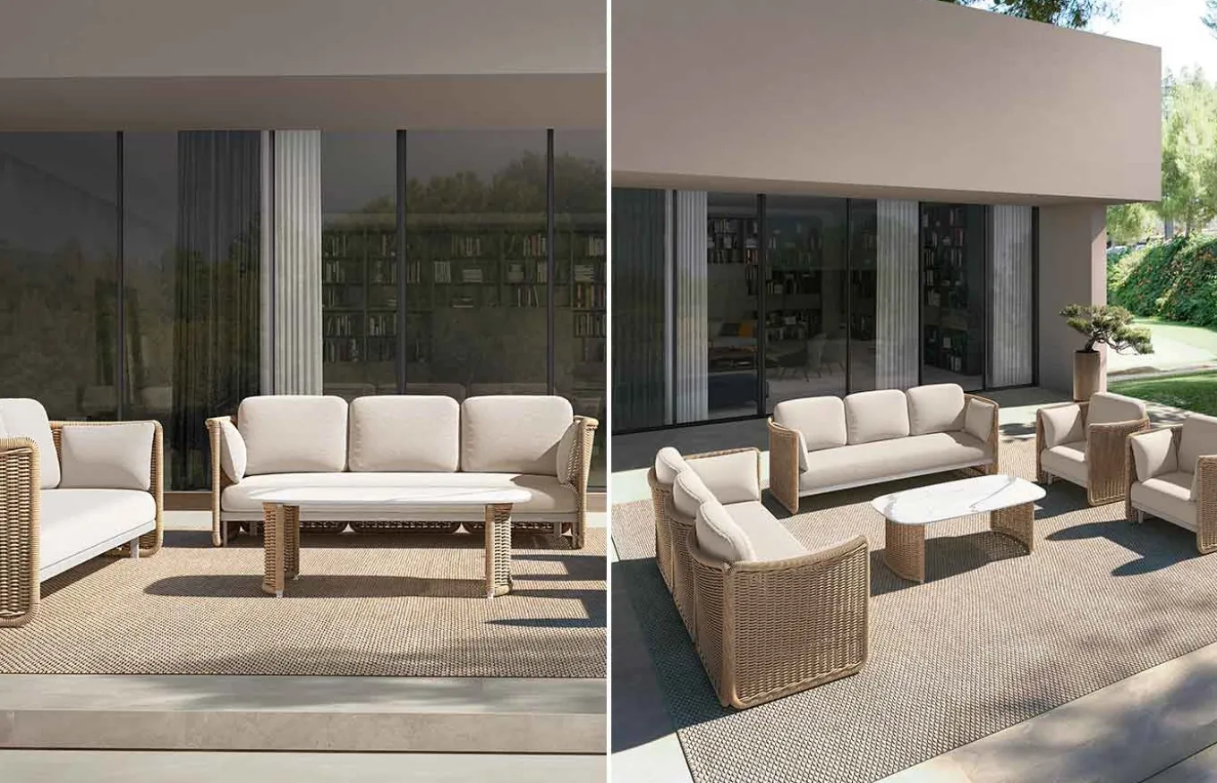 La colección de exterior Catalina de Agua de Mar destaca por su diseño elegante y materiales de alta calidad, siendo ideal para terrazas y jardines. Esta línea incluye piezas como sofás, sillones y mesas de centro, todas fabricadas con una estructura interna de aluminio lacado en color marfil y revestidas con mimbre trenzado.