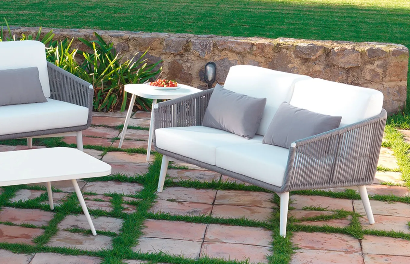 Sofá de exterior Siena de estilo colonial. El mobiliario de jardín con acabado en cuerda de poliéster y cojines tapizados lisos puede ser una opción con estilo para su espacio al aire libre.