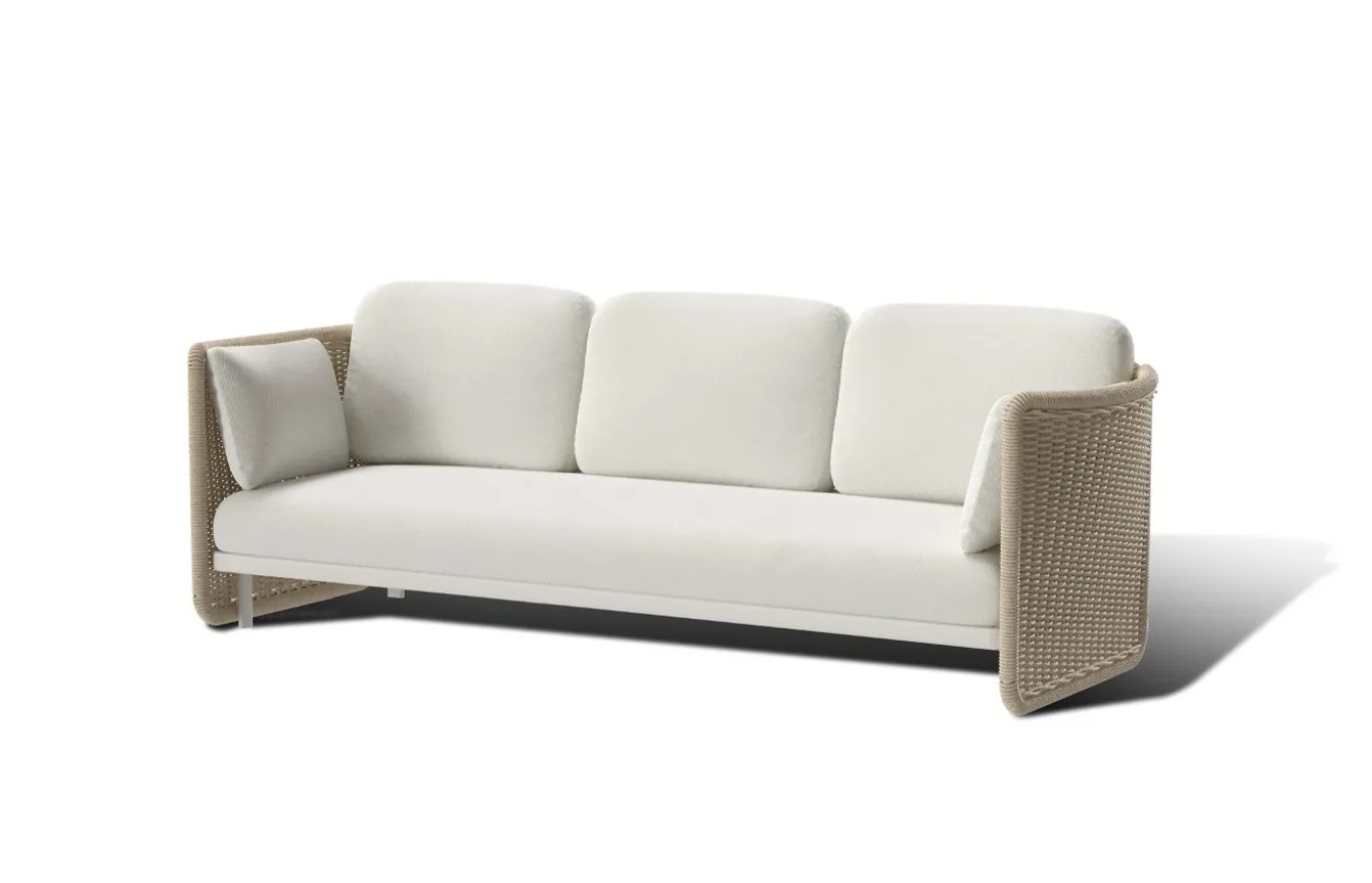 Tiene una estructura interna de aluminio color ivory que le aporta resistencia, mientras que en la parte externa tiene mimbre trenzado de color natural. También cuenta con amplios cojines de asiento y respaldo, disponibles en una gran variedad de tapizados para adaptarse a cualquier espacio.