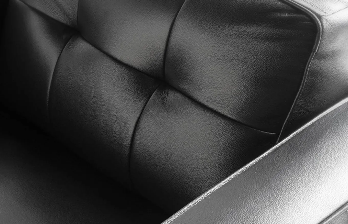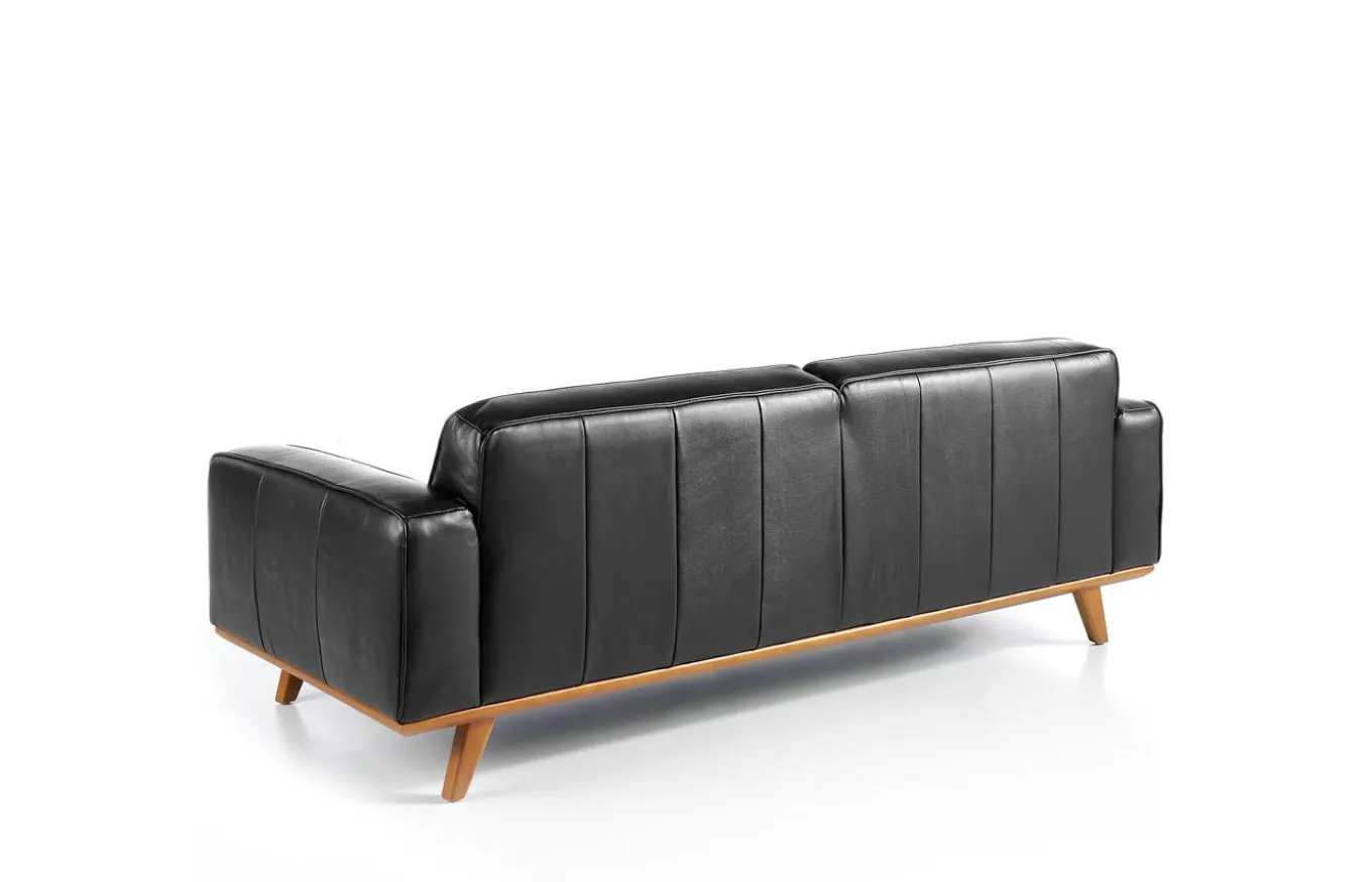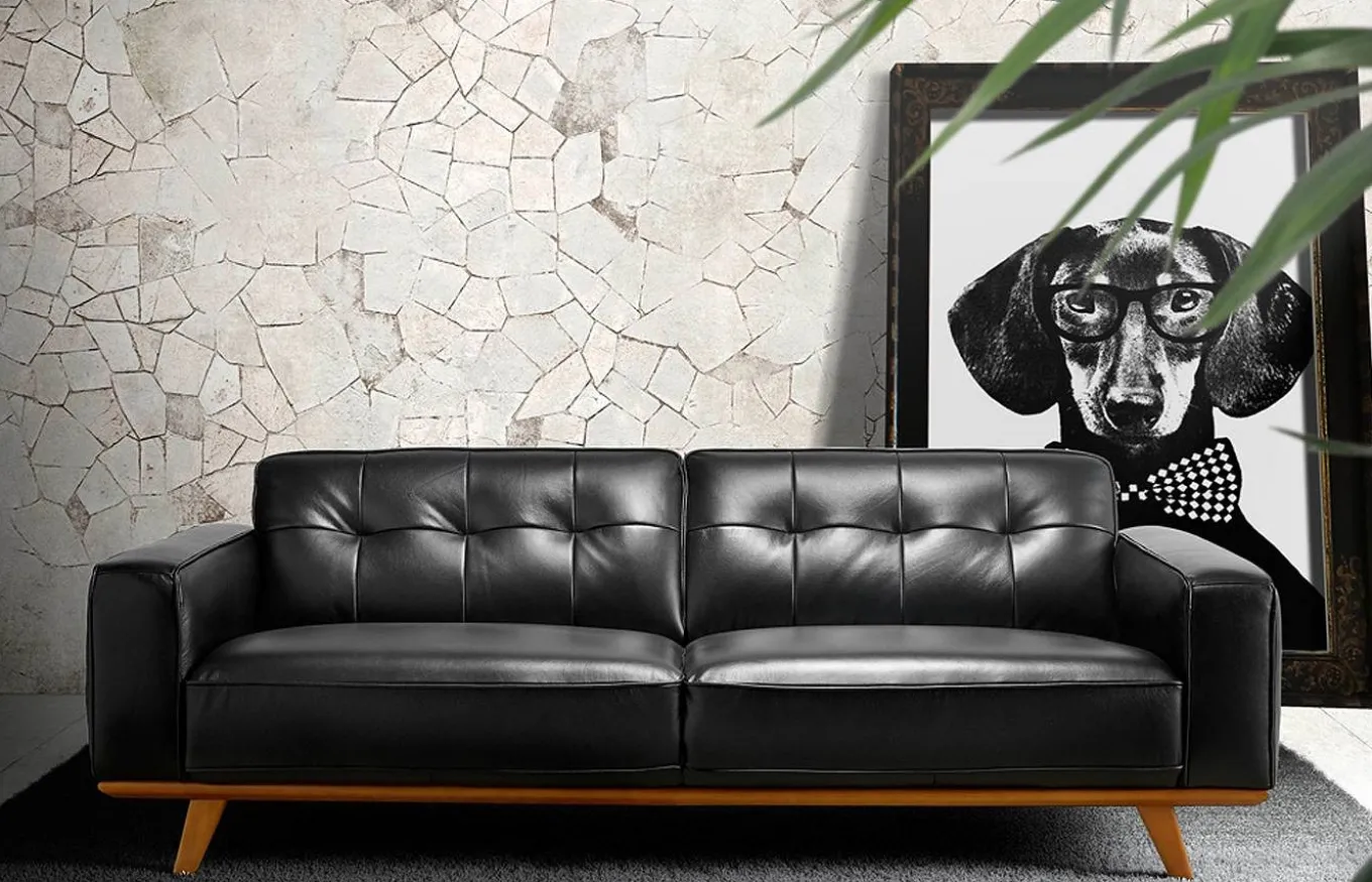 Sofá muy identificativo y con gran personalidad, que combina perfectamente los estilos moderno y vintage. Tapizado en piel de color negro, con patas de madera color nogal.