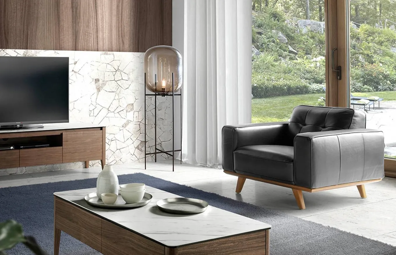 - Tapizado en piel de origen vacuno de 1.5 mm de espesor, con patas de madera color nogal.