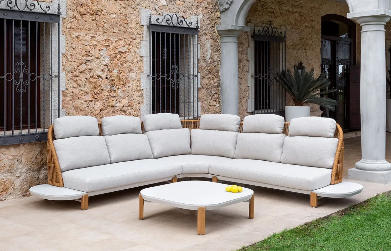 La colección Delfos de Arkimueble está diseñada para ofrecer elegancia y funcionalidad en espacios exteriores. Cada pieza combina una estructura de aluminio termolacado, respaldos de fibra sintética trenzada y patas de madera de teca, materiales seleccionados por su resistencia y estética. Los cojines están tapizados en tejidos aptos para exteriores, garantizando comodidad y durabilidad. Se recomienda utilizar esta colección en áreas exteriores cubiertas para prolongar la vida útil de los materiales.