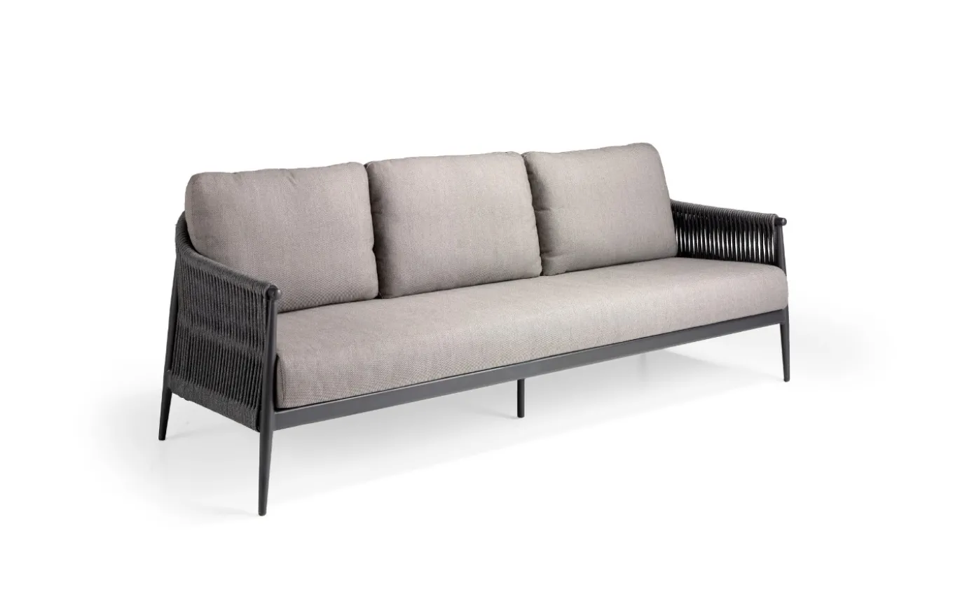 El sofá Termoli de Agua de Mar es una pieza de mobiliario elegante, ideal para espacios exteriores. Está fabricado con una estructura de aluminio resistente en color carbón que se complementa a la perfección con la cuerda redonda del mismo color, formando los brazos y el respaldo.
