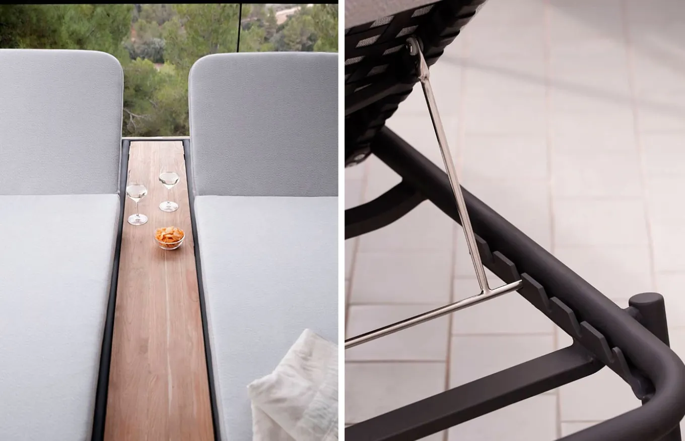 - Aluminio carbón mate: material sometido a un tratamiento galvánico que proporciona una protección mejorada contra la corrosión. Luego, los muebles se terminan con un recubrimiento en polvo de alta calidad que se aplica mediante un proceso de horneado, garantizando un acabado suave, duradero y resistente a las condiciones climáticas.