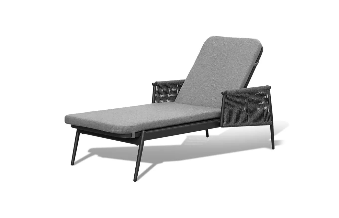 La tumbona Termoli de Agua de Mar es una pieza de mobiliario elegante, ideal para espacios exteriores. Está fabricada con una estructura de aluminio resistente en color carbón que se complementa a la perfección con la cuerda redonda del mismo color, formando los brazos y el respaldo.