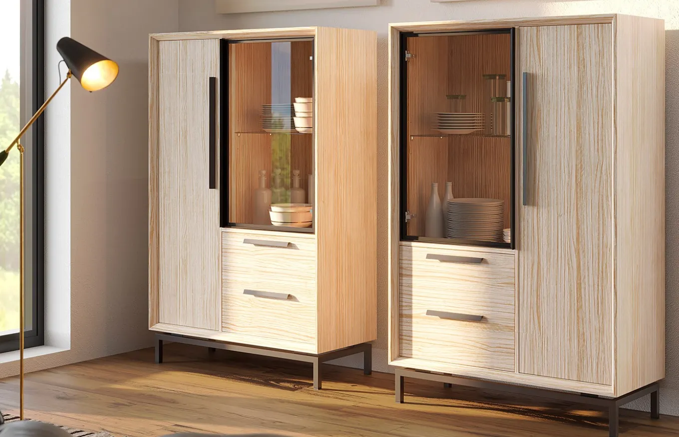 La vitrina Estoril aporta un estilo moderno y personal la estancia. Es una pieza sencilla, versátil y sobre todo elegante. La vitrina Estoril cuenta con dos puerta batientes y dos cajones extraíbles.