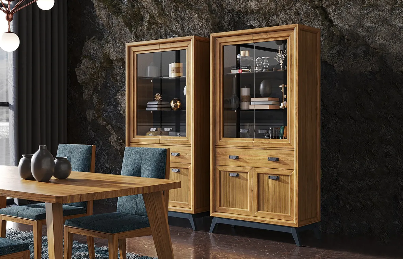 La vitrina Rodas aporta comodidad y personalidad a la estancia. Es una pieza sencilla, versátil y sobre todo elegante. La vitrina Rodas cuenta con dos puertas, un cajón extraíble y una vitrina con estantes en su interior.